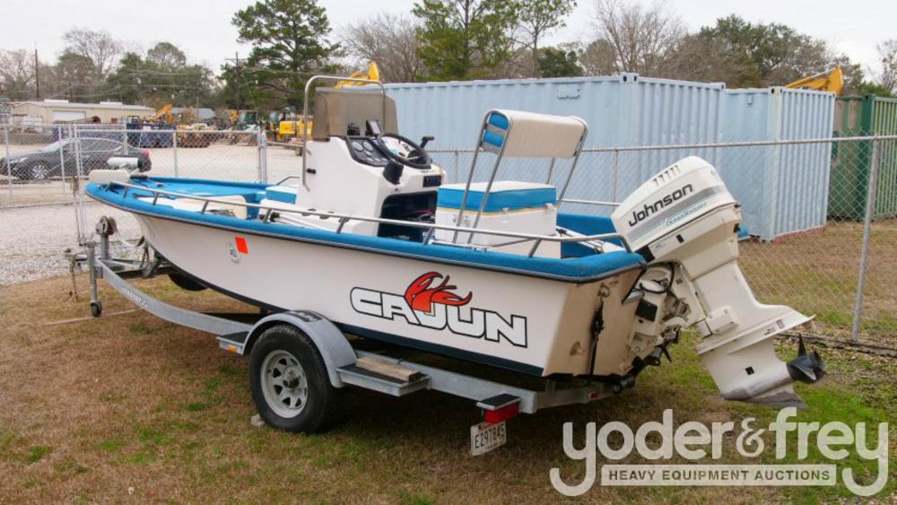 1996 Cajun 1850V FISHMASTER Boat w/ 1996 Johnson Out board Motor, 1996 Trolling Motor, Rigging, SS Prop, Bimini Top, Boat Cover c/w 1996 F 2S Trail Boss Custom Trailer - M**********6
