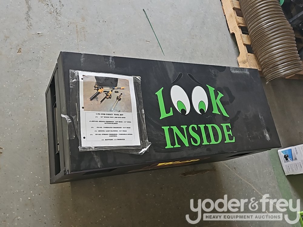 LOT # 0067A -- Wood Tuff Tow 48" Box---7 Pc Cub Cadet Tool Kit-, Hedge Trimmer, Cordless Chainsaw, Leaf Blower, String Trimmer, Battery Charger