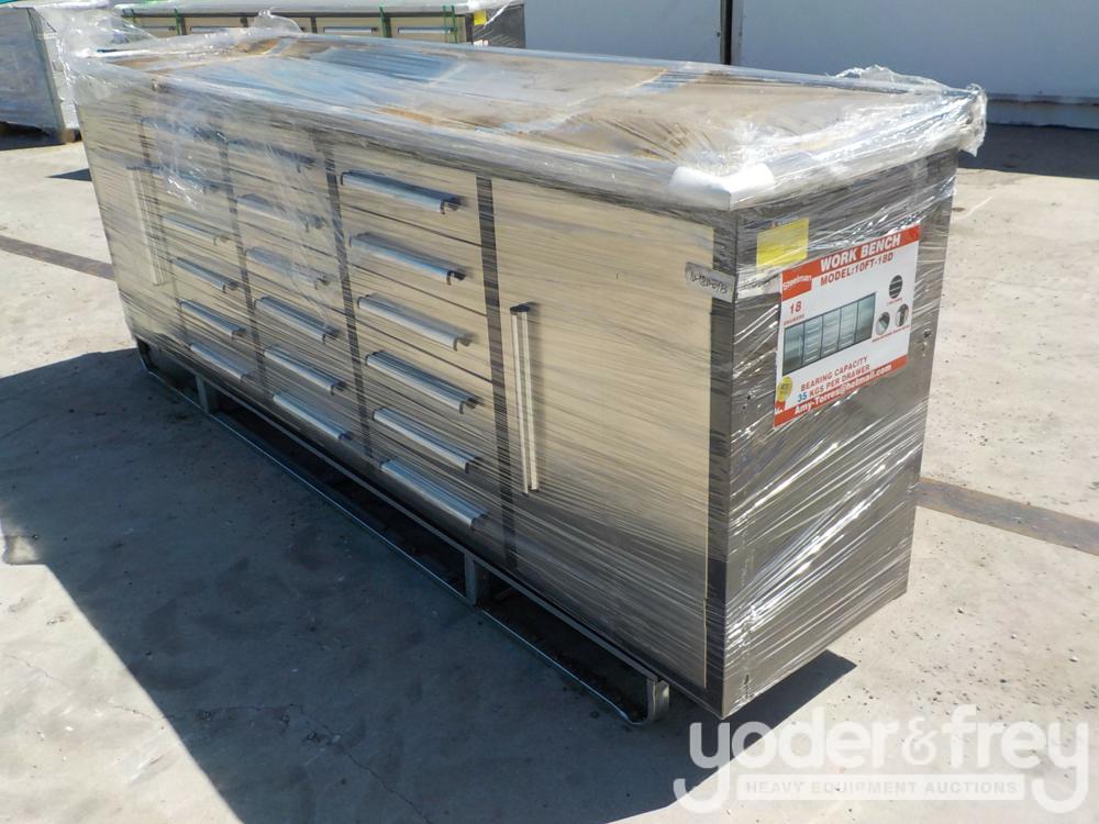 Unused 2021 Steelman 10' Work Bench c/w 18 Drawers & 2 Cabinets, Drawer Locks, Anti-Slip Inners, 3 Rail Sliding, (Stainless Steel) - 1******5