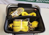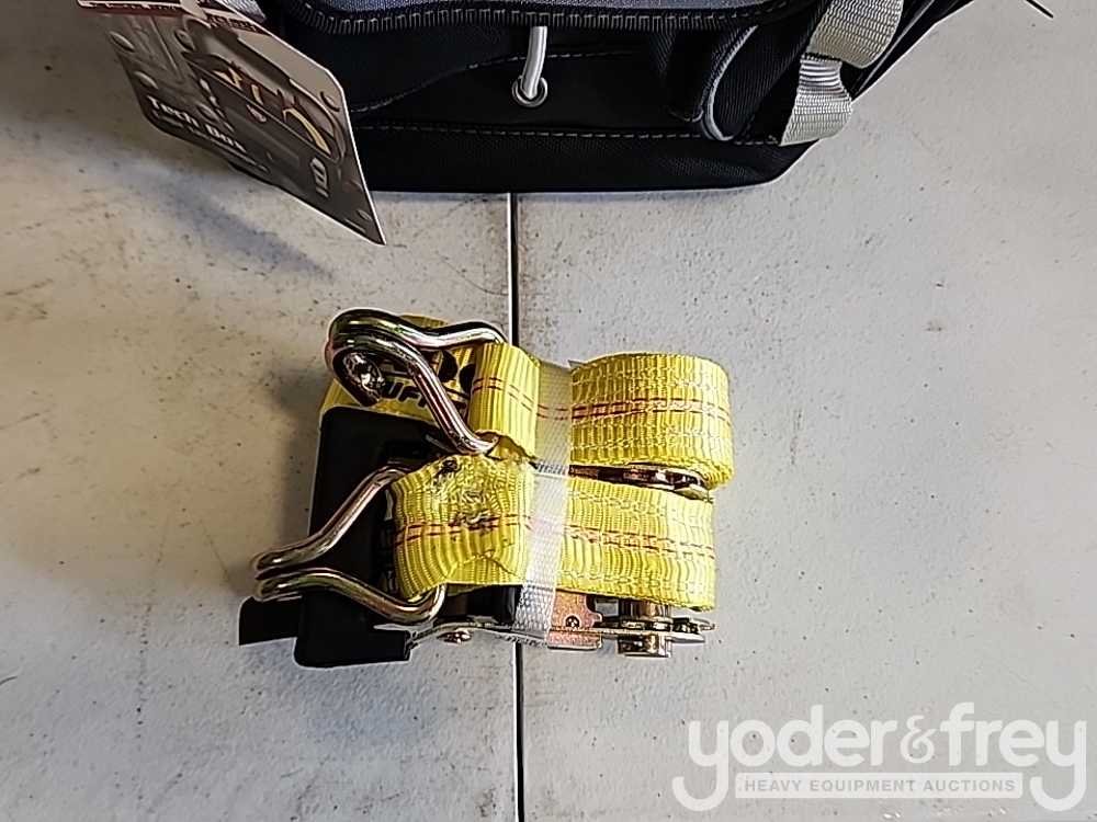 Unused 1 1/2" x 15' Tuff Tow Ratchet Straps (8 of) c/w 12" Professional Tool Bag - 5****3