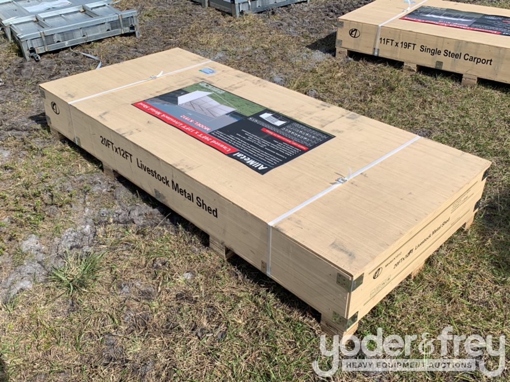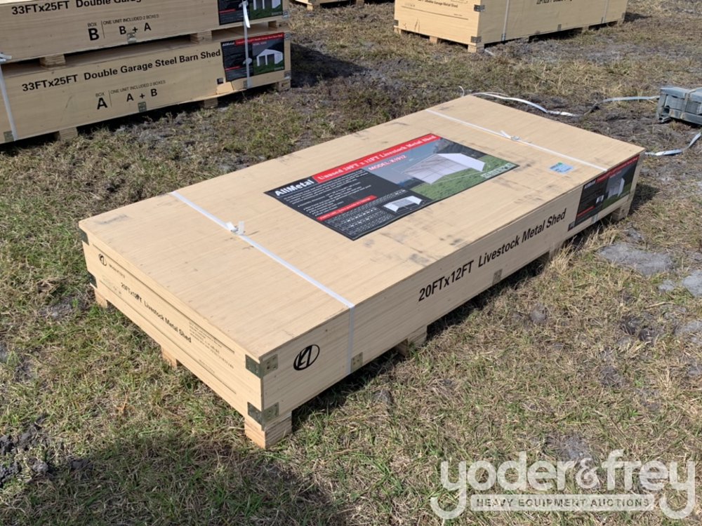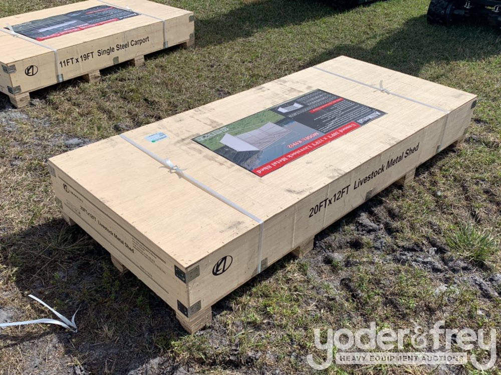 Unused Allmetal K1912 Assemble Size:125” Tall In Front,100” Tall In Back, 20’ Long,12’ Wide, Material Specifications: Main Frame And Base:16 Gauge 2"Square Steel Tube, Roof Material: 29 Gauge Galvanized Corrugated Steel Panel, Skid Mounted Base, Pull Eyelets On Both Side - A*******7