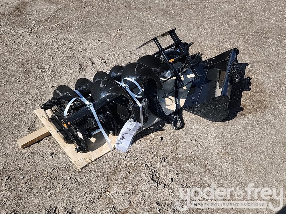 LOT # 0810 -- Unused Quick Hitch, Rake , Ripper, Graber, Auger, 12" Auger Rod, 8" Bucket, 32" Digging Bucket to suit 1-2 Ton Excavator (8 of)