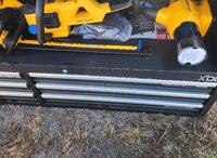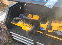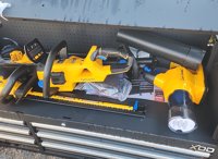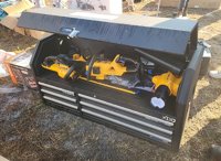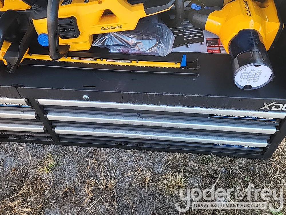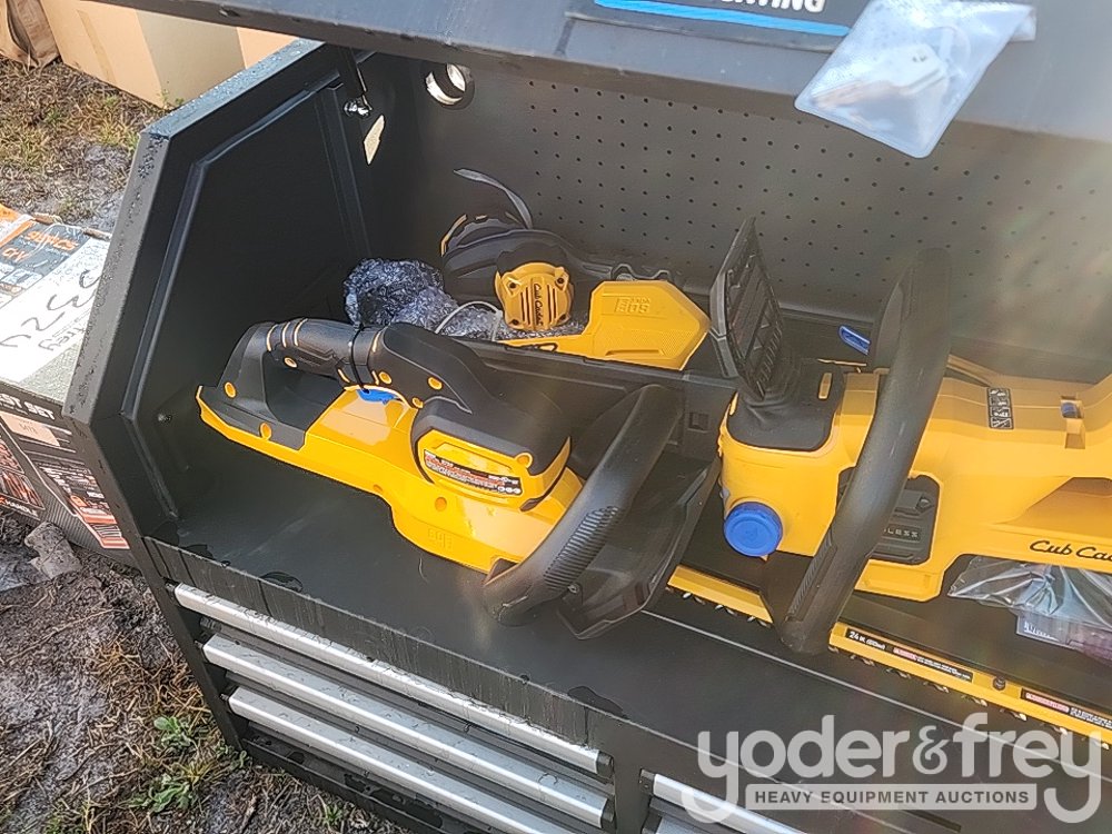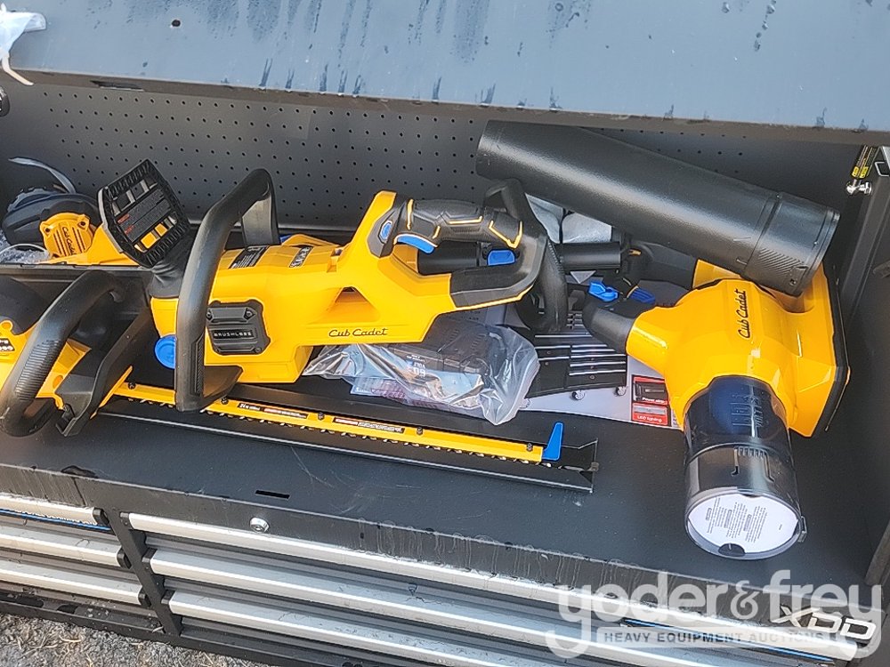LOT # 3325 -- Wood Tuff Tow 48" Box, 7pc Cub Cadet Tool Kit, HT24E Hedge Trimmer, CS160E Cordless Chainsaw, LB600E Leaf Blower, ST15E String Trimmer, Battery, Charger