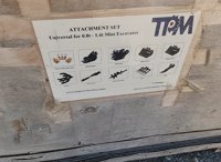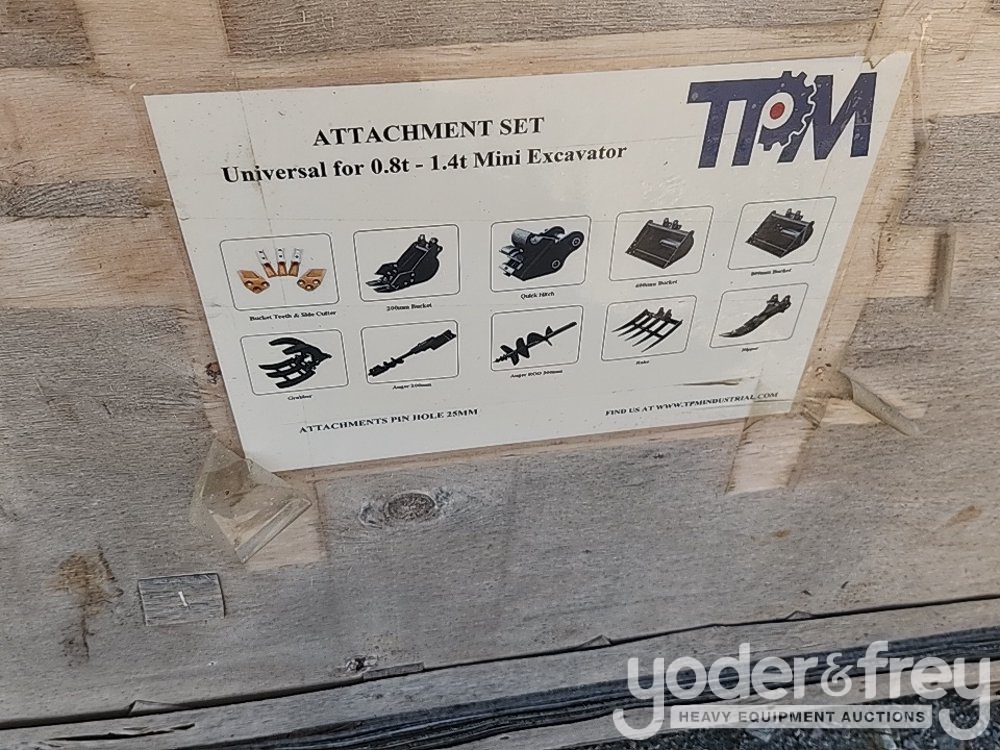 Unused 2025 TPM Qty 10 Attachments to suit Mini Excavator, 5 Pcs Bucket Teeth With Bolts And Nuts, 8” Bucket, 24” Bucket, 32” Bucket, Ripper, Rake, Quick Hitch, 8”, 12” Auger Rod, Grabber In Wooden Box, 1” Pin Hole - 540018784